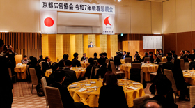 令和7年1月29日に京都市東山区のハイアットリージェンシー京都において、顧問、会員100名以上が出席して令和7年新春懇親会を開催した。「この1年が皆さまに幸多い年になりますことを心から願います」と土井健資理事長(土井志ば漬本舗社長)、雑賀和美会長(京都新聞COM社長)があいさつした後、上條智子副会長(高島屋執行役員京都店長)の発声で、地元伏見の日本酒で乾杯した。コロナ禍も明けアトラクションも復活、ジャグリング国内大会優勝、世界大会決勝などの様々な受賞歴を持つジャグラーの妙技とトークを楽しんだ。そして、年男年女10名による吉例 福豆まきで今年の招福を祈願した。南部和久副理事長(関広社長)が「メッセージを伝えることを大事にする1年にしたい」とあいさつしお開きとなった。